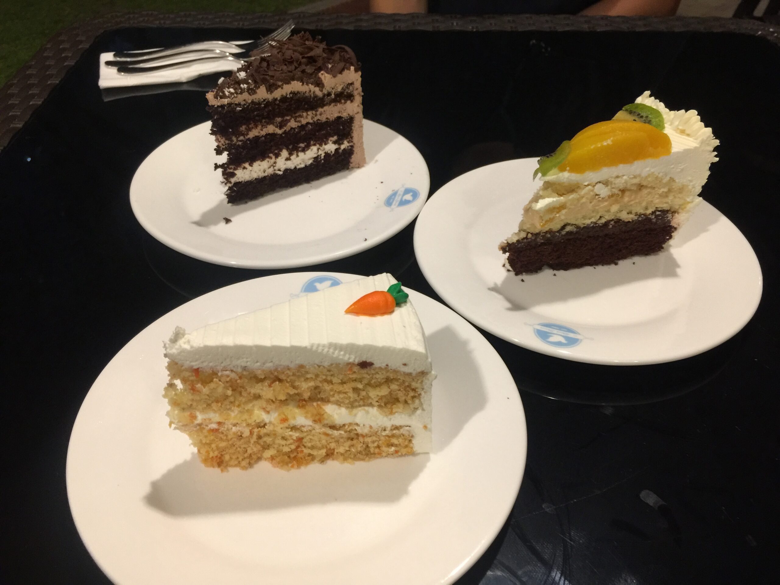 今回はトリプルチョコレートとキャロットケーキ(お店の人いわくヘルシーだそうです😢絶対嘘!笑)とフルーツメドレーという何とチョコレートブラウニーとスポンジケーキがまさかのコラボレーション!!その間にマンゴークリームが挟まり、トッピングにはたくさんのフルーツ まさに贅沢ケーキです 😀