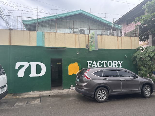 7Dマンゴーチップスの工場直売所は、周囲に倉庫や住宅が点在する静かなエリアにありますが、入口には大きな「7D」ロゴの看板が掲げられており、すぐに見つけることができます。初めて訪れる方でも迷いにくく、Grabのドライバーにも伝わりやすいのがポイントです。
