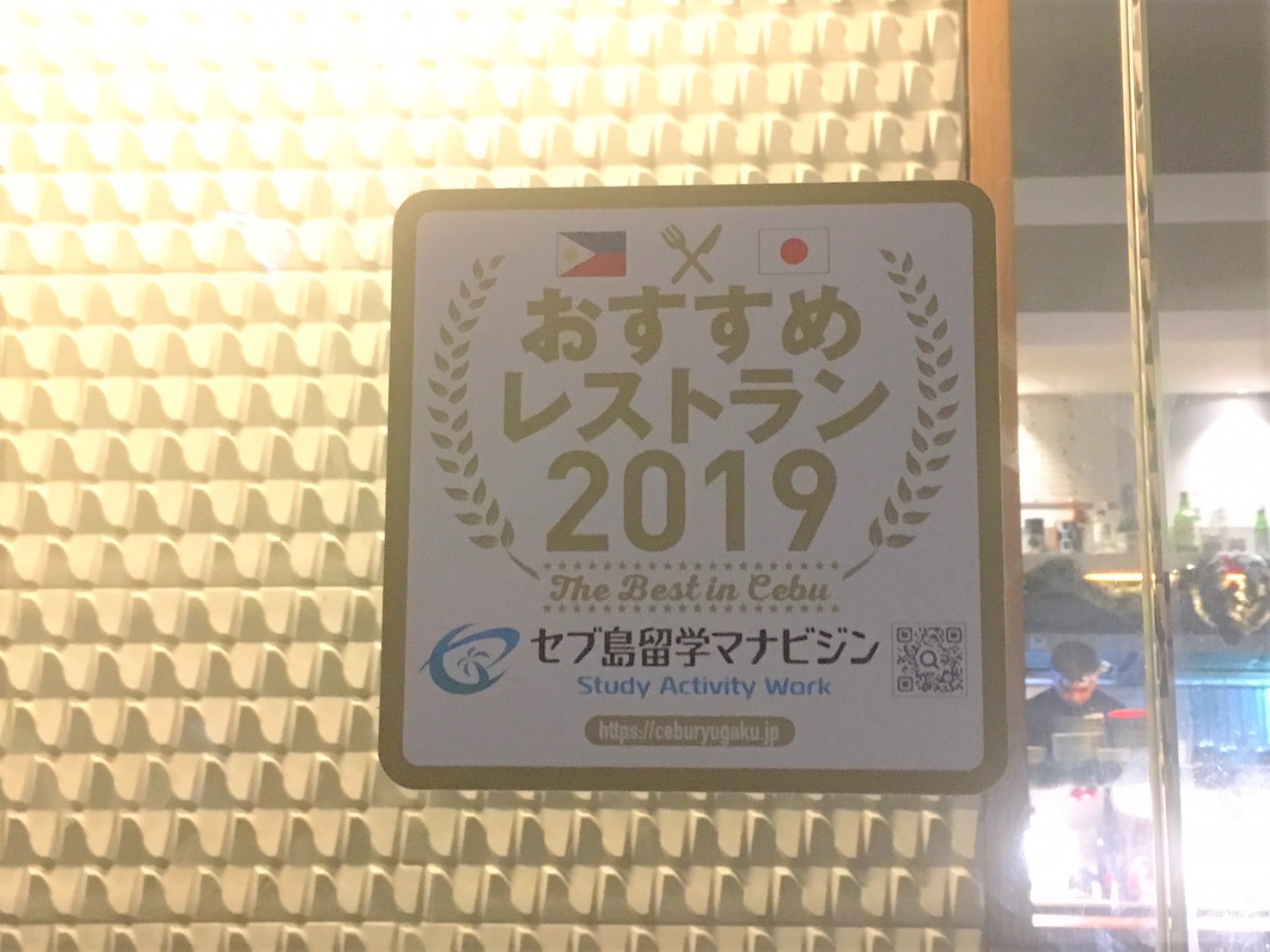 入口には、セブ島留学マナビジンという、セブに関する、おすすめの語学学校やレストランなどの情報を配信してる会社から、2019年度のおすすめレストランの評価を受けたマークが貼ってありました。