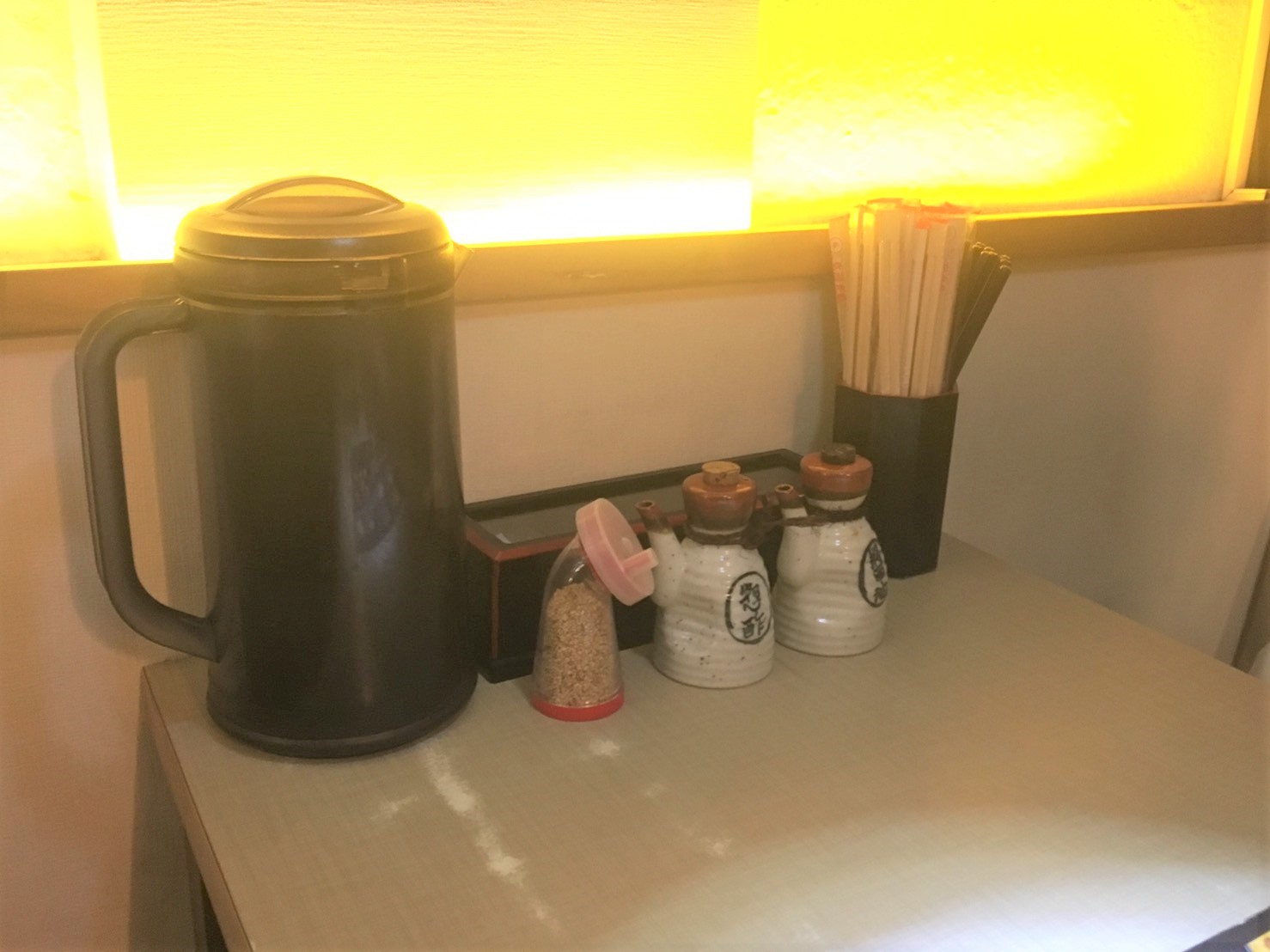 テーブルにはごま、醤油やおろしにんにくなどが置いてあって、僕たちが席に着くと店員さんがピッチャーに入った冷えたお水を持ってきてくれました♪