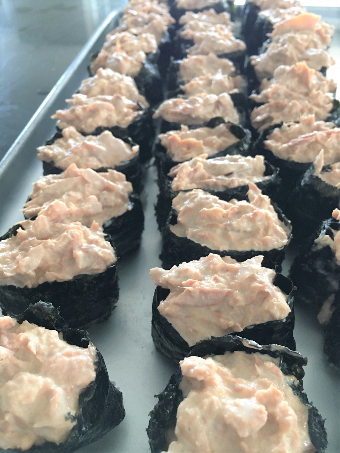 酢飯に海苔を巻くところまでは、植野さんがしてくださっていたので、僕たちはツナマヨをを上に乗せただけ。笑
