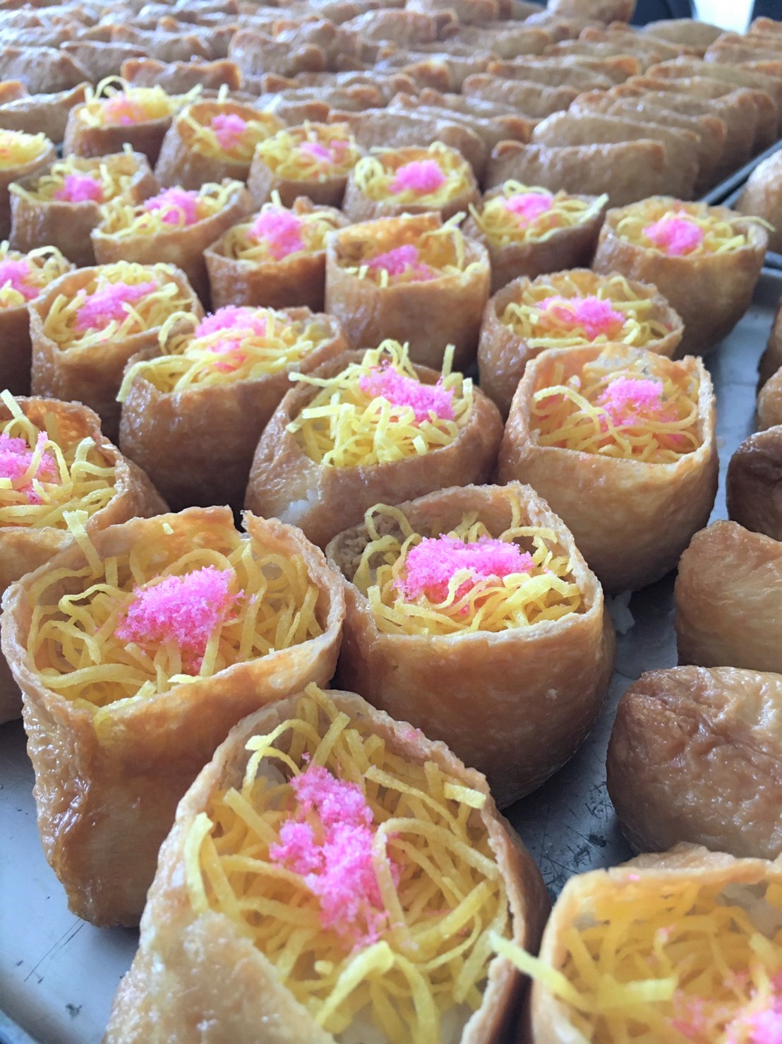こちらは薄く切られた油あげの中に酢飯のほか、タクアンやサクラでんぶを盛り付けたられたいなり寿司!