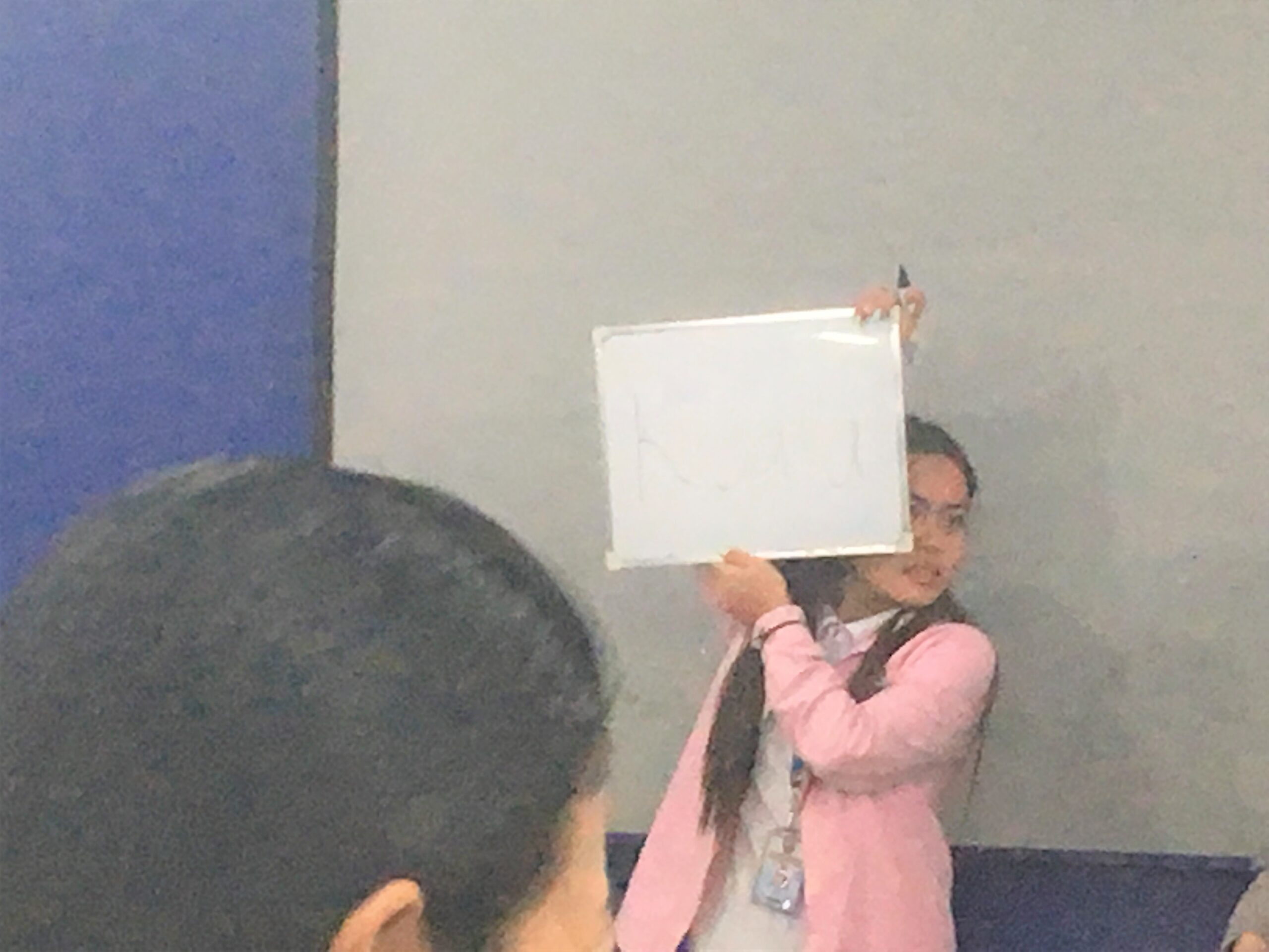 先生たちが順番に小さなホワイトボードに英単語を書いて、ゲームに参加してるみんなに見せると…