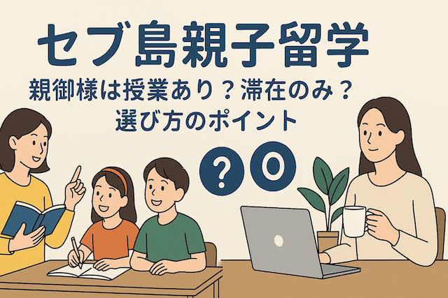 セブ島の親子留学は、子どもだけでなく親御様にとっても魅力的な学びと体験の場です。親も一緒に授業を受けることで共に成長できる一方、「子どもが授業に集中する時間は親はサポートやリラックスに専念したい」と考えるご家庭もあります。どちらを選ぶかによって、親子留学のスタイルや得られる体験は大きく変わります。本記事では、親御様が授業に参加する場合と滞在のみの場合の違いと、それぞれの選び方のポイントをわかりやすく解説します。