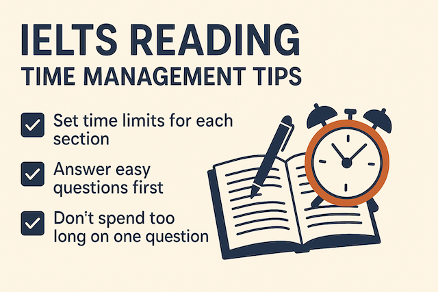 Time management in IELTS Reading is about balance: reading quickly without losing comprehension, answering efficiently without rushing, and keeping calm under pressure. By following structured time allocation, practicing under exam conditions, and applying strategies like skimming, scanning, and skipping difficult questions, you can maximize your score within the 60-minute limit. Remember, consistent practice is the only way to transform these strategies into habits that work naturally during the test.