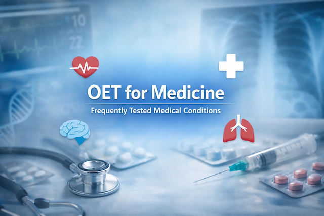 Commonly tested medical conditions in OET for Medicine include diabetes, hypertension, asthma, chronic obstructive pulmonary disease (COPD), stroke, myocardial infarction, pneumonia, dementia, depression, anxiety, fractures, osteoarthritis, gastroenteritis, and various infections. These conditions are frequently used because they are highly relevant to everyday clinical practice and can be adapted into realistic referral letters, discharge letters, case notes, and speaking role-plays. In many OET tasks, the condition itself is not the only challenge. Candidates must also understand the patient’s symptoms, social background, treatment history, progress, and reason for referral. That is why learning the condition name alone is not enough. You should also study related symptoms, investigations, medications, and management plans so that you can respond naturally and accurately in the exam.