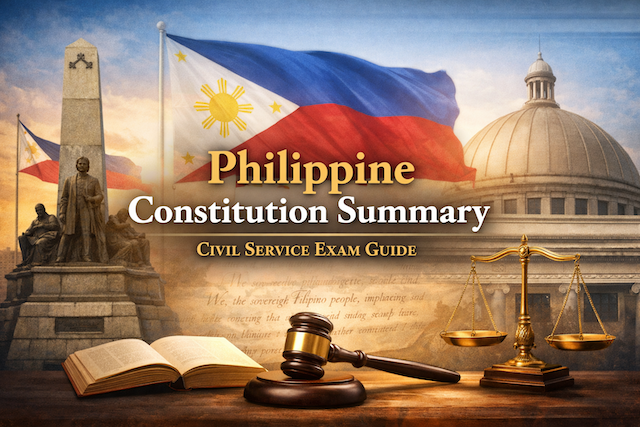 The Philippine Constitution is the supreme law of the land. It establishes the framework of the Philippine government, defines the powers and limitations of each branch, guarantees fundamental rights of the people, and sets guiding principles for governance and national development. For the Civil Service Exam, understanding the Constitution is essential because many questions test both factual knowledge and conceptual understanding of its provisions.