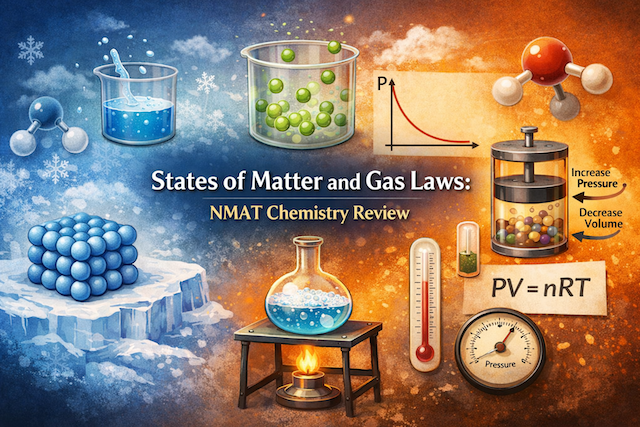 Understanding the states of matter and gas laws is a high-yield topic for the NMAT because it connects microscopic particle behavior to macroscopic properties you can measure (pressure, volume, temperature, and moles). Many NMAT questions test whether you can interpret particle motion, phase changes, and apply gas-law relationships quickly and correctly. This review builds a strong foundation: how solids, liquids, and gases differ; how phase transitions work; and how to solve common gas-law problems, including ideal and real gas behavior.