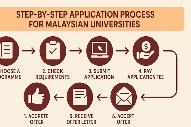 You create an account on the university portal, select your program, complete personal and academic sections, upload certified documents, and pay a nonrefundable application fee (often RM100–RM500). After submission, you’ll receive an acknowledgement email. Processing typically takes 2–6 weeks, followed by a conditional or unconditional offer if successful.