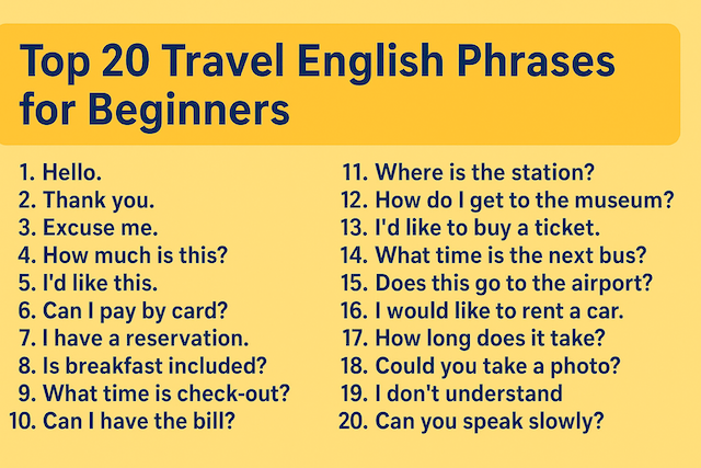 You don’t need to master complicated grammar to travel confidently. These 20 beginner-friendly English phrases are enough for most travel situations: hotels, restaurants, shopping, and emergencies. The key is to speak clearly, stay polite, and not be afraid to ask for help.