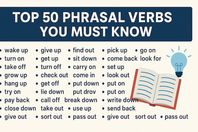 Because phrasal verbs appear constantly in spoken and written English, mastering them will greatly improve your fluency. Below, you’ll find 50 essential phrasal verbs with explanations and examples to help you use them confidently.