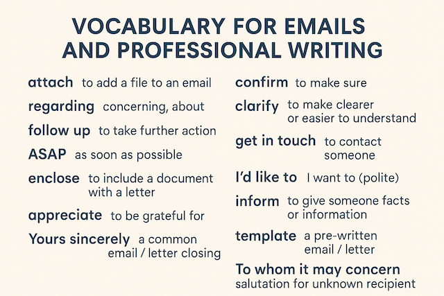 Vocabulary choice makes a significant difference in email and professional writing. By mastering phrases for greetings, requests, clarifications, apologies, and closings, you can ensure your communication is clear, respectful, and effective. Whether you’re contacting a client, manager, or colleague, these vocabulary strategies will help you project professionalism and confidence.