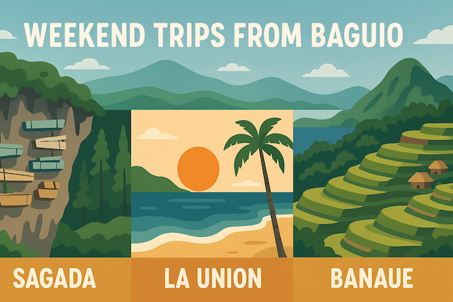 The top three classic weekend trips from Baguio are Sagada, La Union, and Banaue. Sagada offers mystical caves, hanging coffins, pine forests, and chilly mornings perfect for hiking and coffee. La Union is the closest beach escape, famous for beginner-friendly surf, café culture, and sunsets. Banaue showcases the world-renowned rice terraces and immersive trekking in Ifugao country. Together, they cover mountains, sea, and cultural heritage—three distinct experiences within one long weekend radius.